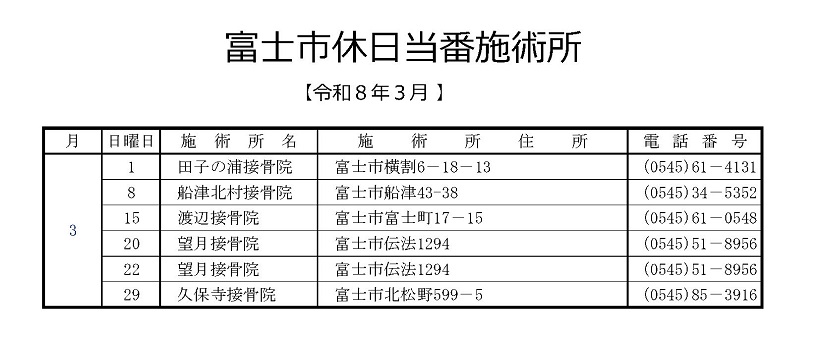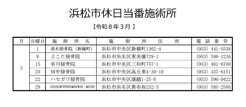 なお柔道整復師会休日当直当番割院の受付については富士市が午前9時~午後5時、浜松市では午前9時~午後5時までとなっています。データは各市それぞれJPG画像形式で掲載しておりますので、スマートフォン等で表の画像をコピーしSMSやLINE・メール等に添付してご利用になれます。